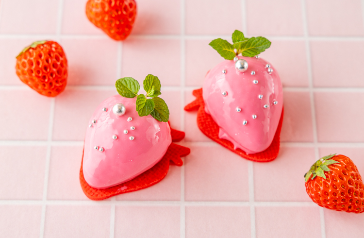 艶やかなパステルピンクのグレーズに包まれた、いちご型のフロマージュムース。ストロベリーやラズベリーの酸味で爽やかに仕上げました。