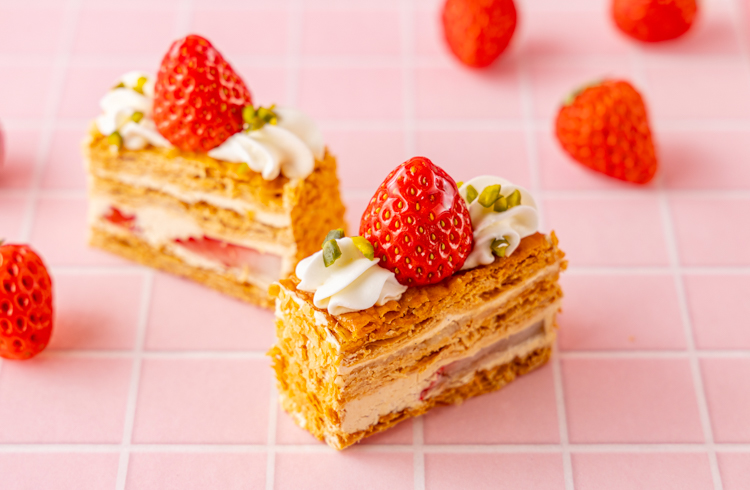 香ばしく焼き上げたパイ生地に、アーモンドプラリネ風味のカスタードクリームとフレッシュストロベリーを重ねた伝統的なフランス菓子。