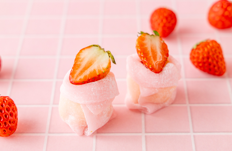 いちご、桜餡、カスタードクリームをもっちりとした求肥クレープでくるみました。