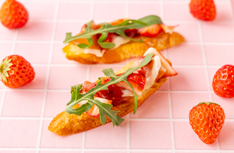 イタリアのおもてなし料理「クロスティーニ」を、いちご、生ハム、ルッコラで華やかにアレンジ。甘みと塩味が心地よく重なる一品。