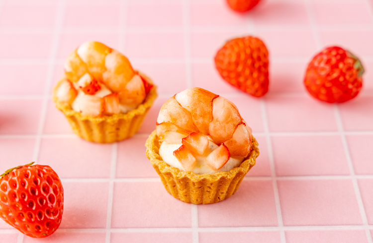 タルトカップにチーズクリームを絞り、マリネしたシュリンプを添えました。複雑な塩味と酸味が、いちごの甘さを引き立てます。