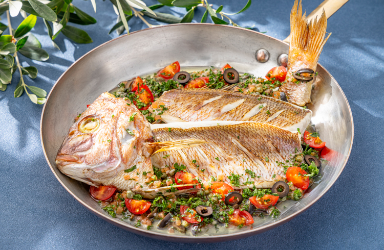 地中海のエッセンスを映した一皿。しっとりと焼き上げた白身魚に、トマトのコンフィ、ケッパー、オリーブを合わせた爽やかなヴィエルジュソースを添えて。