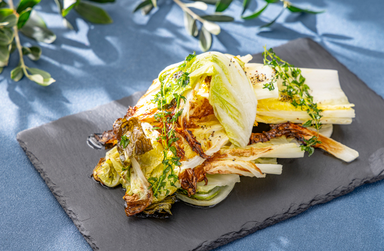 昆布茶の旨みとハーブの香りを重ね、じっくりローストして白菜の甘みを引き出しました。タイムの爽やかな香りを添えた、シンプルながら奥深いヴィーガンメニュー。