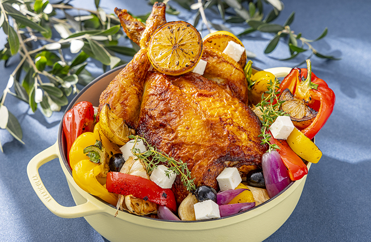 丸ごとの鶏をレモンとガーリックでじっくりマリネし、香ばしく焼き上げました。フェタチーズやオリーブを添えて、ギリシャの風を感じる爽やかな一皿に仕上げています。