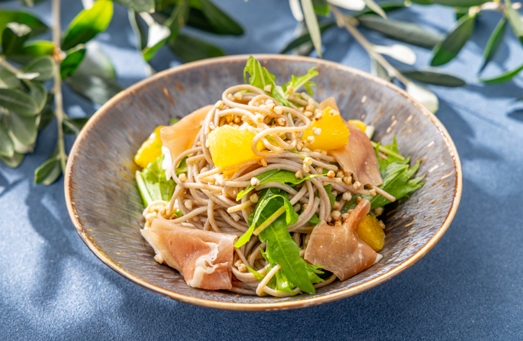 そばに生ハムやセルバチコなど、洋の食材を組み合わせた新感覚のサラダ。オレンジの爽やかな酸味とそばの香りが軽やかに重なり、華やかな一皿。