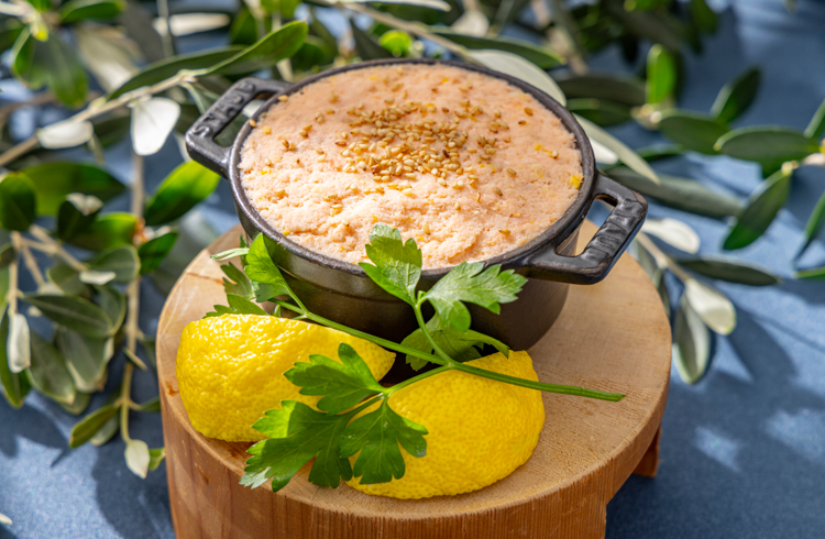 サーモンリエットに、白胡麻の香ばしさと柚子の爽やかな酸味を重ねた一皿。和と南欧のエッセンスが響き合い、奥深い味わい。