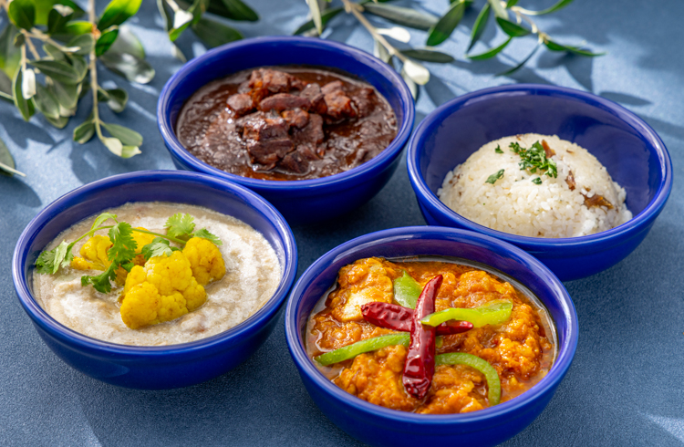 日替わりで2種類のカレーをご用意。さらに週末には、地元のお肉専門店スギモトと共同開発した「黒毛和牛と八丁味噌のビーフカレー」が登場。ライス、ナンやパパドと合わせて。