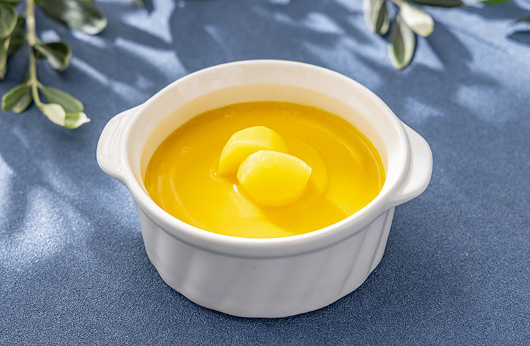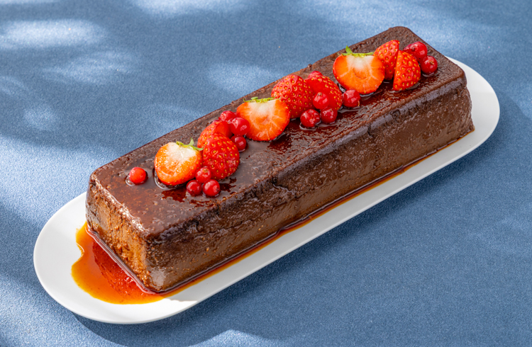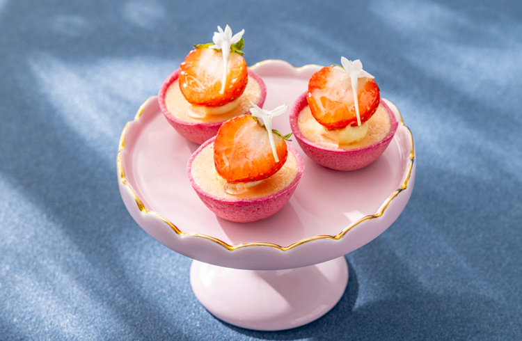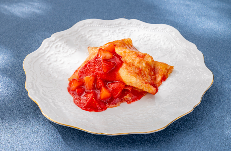 香ばしく焼き上げたクレープに、柚子がほのかに香るなめらかなカスタードを包み込み、カラメル風味のいちごピューレで温かく仕上げた一皿。