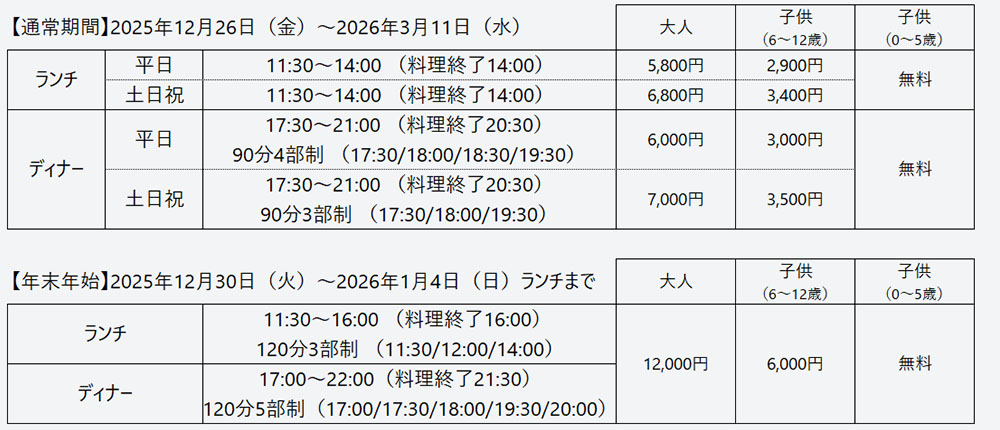 ※2025年12月26日(金)~12月29日(月)は、通常期間の土日祝料金及び、土日祝90分3部制を適用。
