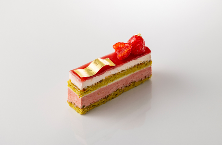 ピスタチオ生地にミックスベリーのバタークリームと、ホワイトチョコレートガナッシュを重ねたオペラ風ケーキ。